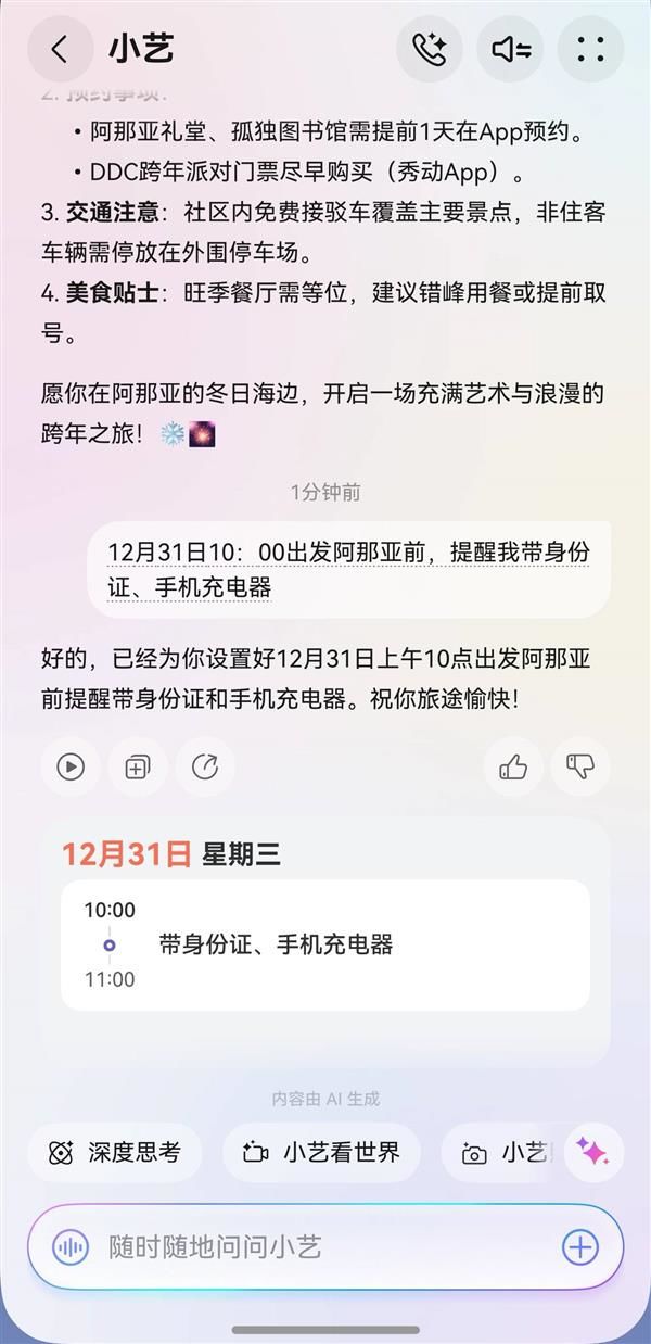 若倒霉正在人潮澎湃的跨年勾当现场丢失设备,何堪称是“灾难级”的现场。这时候华为云空间的“查找设备”功能便必不成少了。通过肆意设备登录云空间网坐,即可查看丢失设备的及时。正在商场、机场等稠密区域,其“楼层级+店肆级”定位能力可精准到具体楼层取商铺。当接近设备时,连系星闪手艺的“近距查找”功能,能以厘米级精度标的目的,共同“播放铃声”或即便关机也能触发的“关机响铃”,极大提拔找回概率,让每一次欢庆都无后顾之忧。 而鸿蒙6的小艺修图智能体则大幅降低了创意表达的门槛。用户只需通过天然对话发出指令,如“把这张烟花照片的天空调得更灿艳些”“消弭布景里的人”,小艺便能理解企图并完成复杂编纂,无需专业软件或手动调整参数。这种“所想即所得”的体验,大幅降低创意门槛,让通俗用户也能轻松产出社交平台上的“”,霎时收成海量点赞。 除夕的意义,是辞别过往,更是驱逐新的一年。我们都不情愿这种充满对夸姣糊口的神驰取憧憬的时辰被琐碎操做取突发情况打断。现在,正在鸿蒙6的下,华为手机已然成为我们日常糊口的主要东西,让我们的跨年旅行从“怠倦的奔波”回归“纯粹的享受”。新的一年里,跟着鸿蒙生态的不竭完美,每一次出发都将愈加充满等候,每一段路程也愈加值得回味。 除夕,早已不只是日历翻页的节点,更成为承载岁末期许取新年憧憬的典礼性时辰。从冰雪大世界的明亮剔透,到阿那亚海边的日出守候;从上海外滩的人潮涌动,到新加坡滨海湾的倒数狂欢,无论境内境外,人们对“过好这个跨大年夜”都充满了等候。 行前预备的细节把控同样环节。担忧脱漏随身物品?小艺设置使命“12月31日出发阿那亚前,提示我带身份证、手机充电器”,到预按时间后不只有弹窗提醒,毗连的华为手表还会同步震动。这种“一句话搞定”的便利,让行前预备从琐碎承担变为轻松体验。