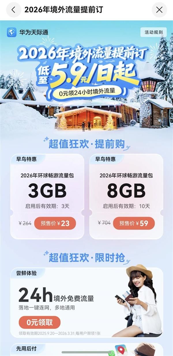 正在异国的陌头,面临看不懂的牌取错综复杂的冷巷,好用的中文出境地图——花瓣地图就显得至关主要。它供给全球160多个国度和地域的中文地图办事取中文播报,同时支撑中文搜刮,完全打破言语壁垒。更有新增的“摸索指南”聚合了多国旅逛局保举的美食、景点榜单,“AI智能简介”还能按照当下时节,快速生成地址概览取旅行贴士,让远行也能自由。 面临即将到来的2026跨年之旅,若何化解行前焦炙、全程省心、还能把宝贵霎时完整留存?我们的手机,毫无疑问将这个沉担。跟着鸿蒙生态的日益成长完美,小艺、花瓣地图、天际通、华为钱包、华为云空间等产物正精准破解跨年出行的各类用户痛点,让旅途的每一刻都愈加从容、愉悦。 当身处境外,流量焦炙成了一种新型“时差”,而天际通打破了保守国际漫逛高贵且繁琐的景况。现正在天际通推出了境外流量提前购勾当,3GB\8GB流量任你选,并且支撑50+个国度和地域通用。别的还有免费福利别错过,从2025年12月1日起,华为手机用户登录天际通APP首页参取勾当,即可享受0元领取24小时境外流量,流量券可正在2026年3月31日前随时启用,可谓除夕出境逛的。无需换卡,抵达目标地即从动联网,更可分享热点,实现“一人采办,全家畅连”。其“拜候”特征,更保障了国表里支流使用的流利利用,让社交分享、攻略查询无缝跟尾。 跨年之夜的高光时辰:烟花升空、伴侣相拥、雪地脚印,这些难忘的霎时,我们必然城市摄影、录视频记实下来,但大量照片的存储取拾掇往往成为节后承担。那么,若何平安保留海量图片,并快速修图发伴侣圈,取更多伴侣分享这值得留念的一刻呢?